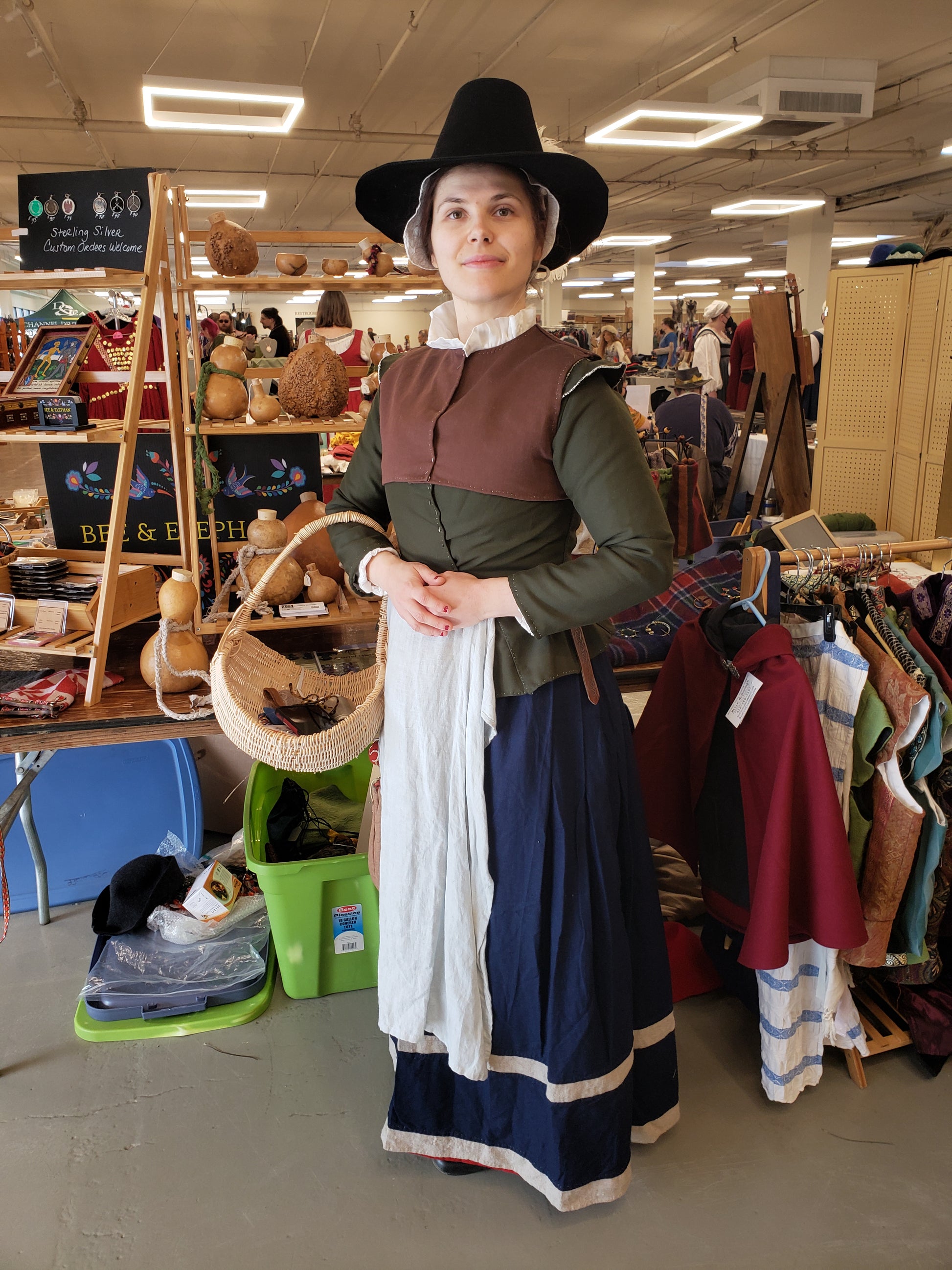 From the 16th-century illustrations of Englishwomen's dress by deHeere comes our Chicken Lady hat. Made of hand-blocked black wool felt with a sugarloaf crown and a broad brim, this is a simple yet elegant option for the Elizabethan gentlewoman.